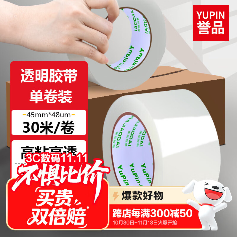 包邮 誉品(YUPIN)透明胶带封箱打包带高品质胶布封口胶纸办公用品批发 宽45mm*长30m(单卷30米)